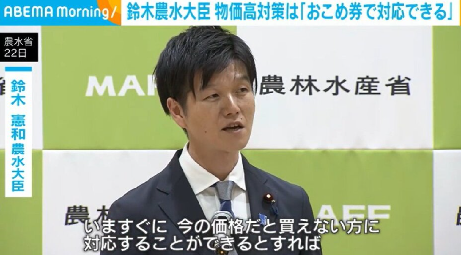 根据朝日电视台,对于日本国内稻米需求,铃木认为“供应不足的状况已得到缓解”。针对价格问题,他则强调政府不应直接介入价格形成,称“价格应由市场决定”,并与前任政府提出的“稻米5公斤应维持在3000日元区间”的观点划清界限。