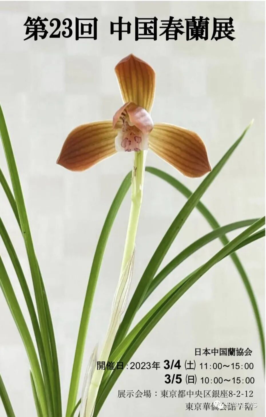 图片中的日文内容如下:《第23回中国春蘭展》由日本中国蘭協会主办,于2023年3/4(土)11:00~15:00与3/5(日)10:00~15:00举办,展示会場在東京華僑会館7階,東京都中央区銀座8-2-12。