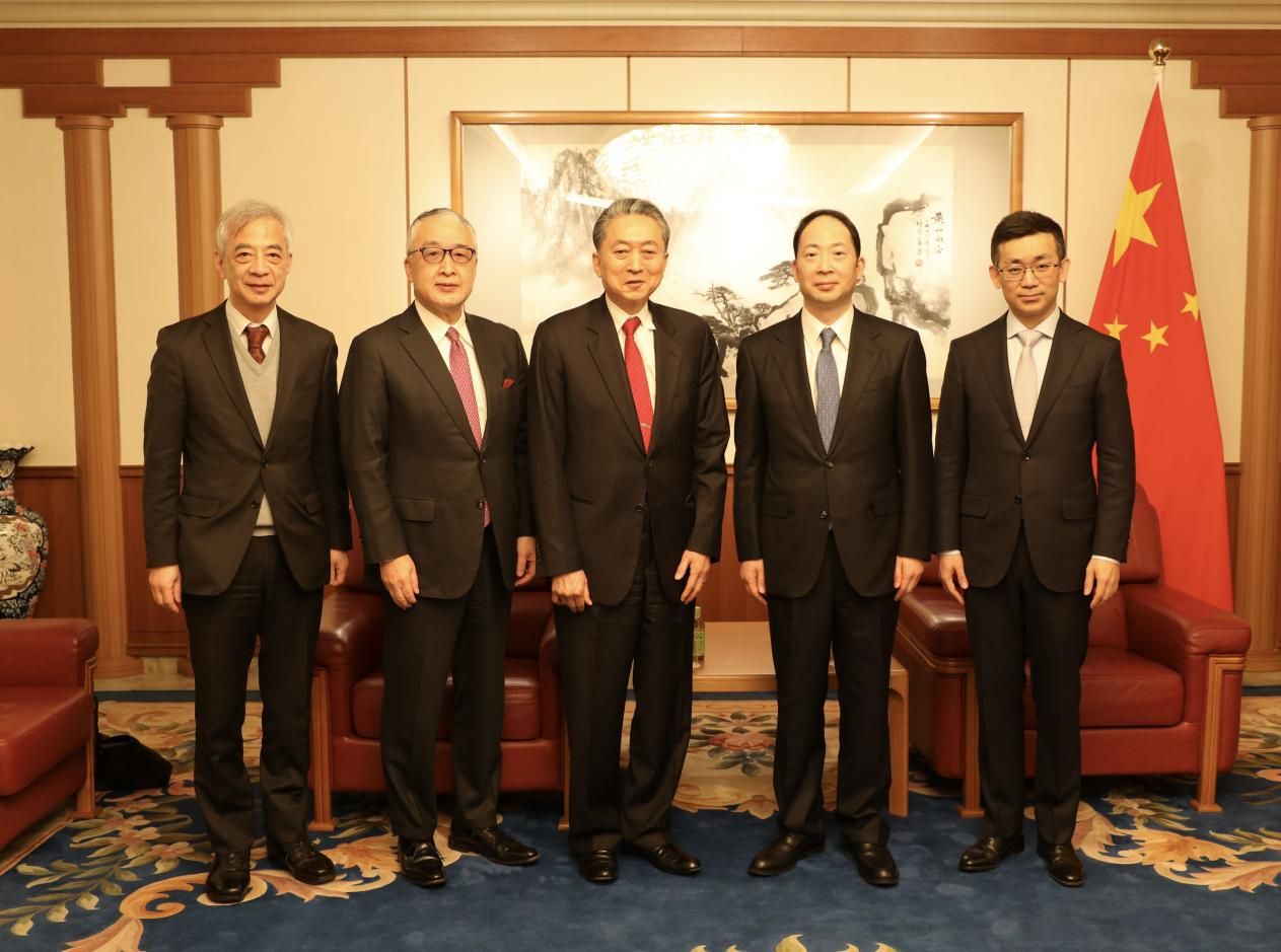 3月1日,中国驻日本使馆临时代办杨宇会见日本前首相鸠山由纪夫。(图/中国外交部网站)