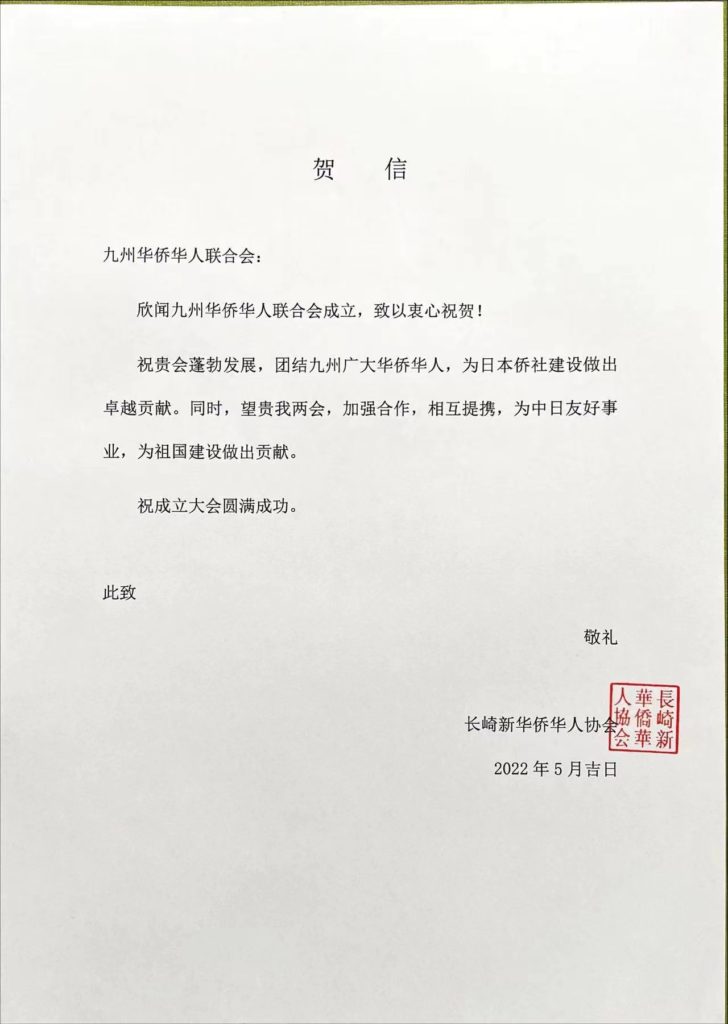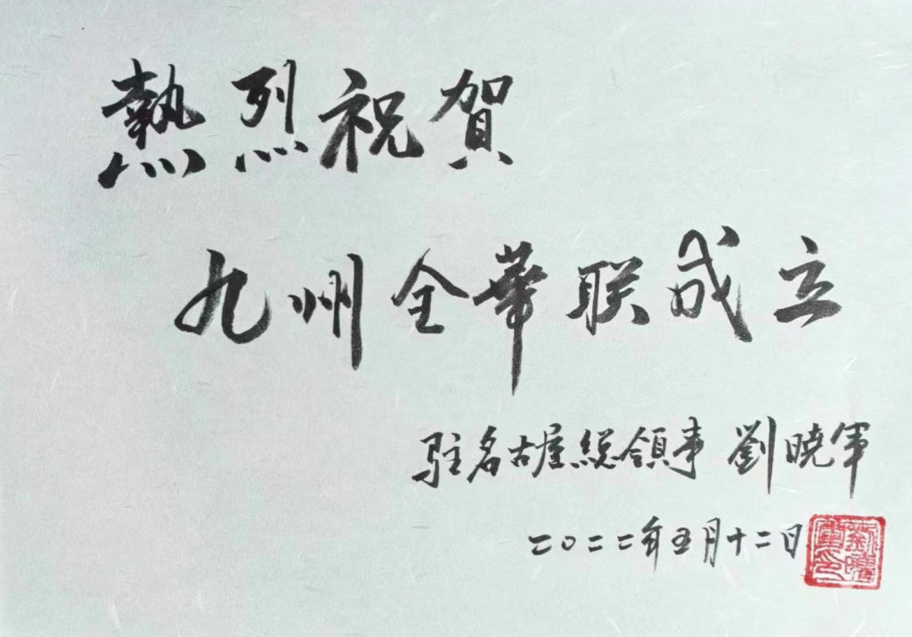 驻福冈总领事律桂军致辞祝贺大会成立。当天出席成立大会的还有九州华侨华人联合会理事长姚明、冲绳新华侨华人总会会长岛袋云茜、长崎新华侨华人协会名誉会长刘震、中部日本华侨华人联合会顾问委员会主席/全华联常务副会长、北海道中国会会长田义之、华谊会代表杨爱琳、中部日本华侨华人联合会顾问委员会主席唐启山、NPO法人日中国际交流中心代表王金芝、九州华文教育理事长谭爱荣、NPO法人日中国际交流中心代表王金芝等。