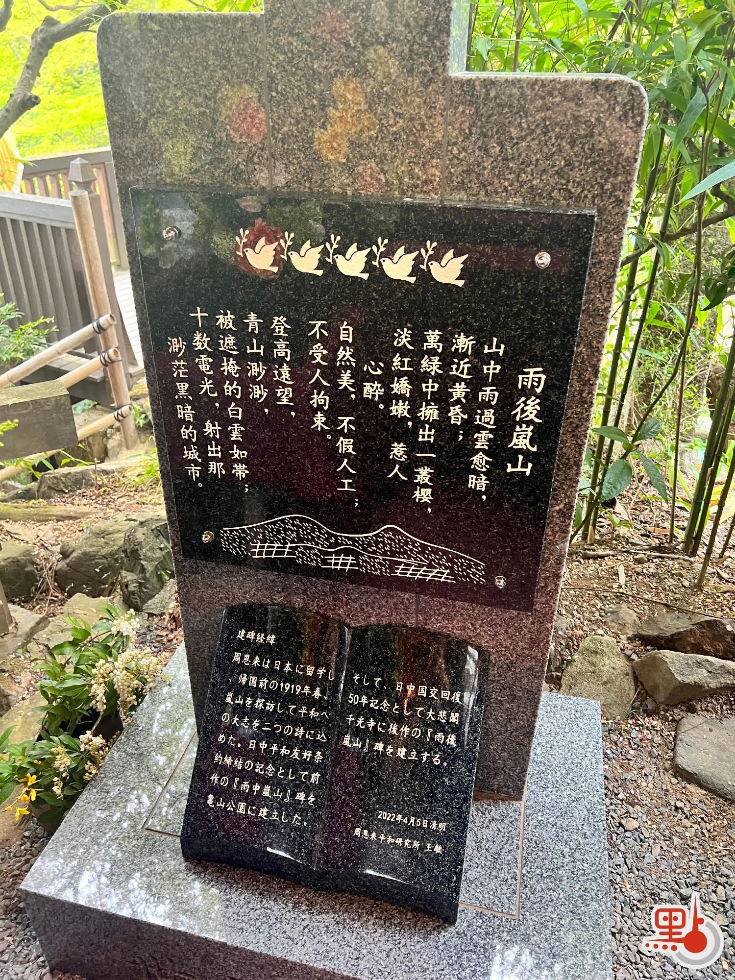 1919年4月5日,青年周恩来游历于日本京都岚山并下两首著名诗作《雨中岚山》和《雨后岚山》。1979年,为纪念周恩来总理为中日邦交正常化所作出的贡献,《雨中岚山》诗碑在岚山龟山公园建成;2022年4月5日,《雨后岚山》诗碑在岚山大悲阁千光寺内揭幕。双座诗碑并立世界遗产岚山,记载着百年过去,并建立起两国友好交流之桥。为纪念周恩来总理和平的贡献,以及纪念中日和平友好条约缔结45周年,2023年清明节当天,特于岚山举办“周恩来祭”纪念交流宴会。