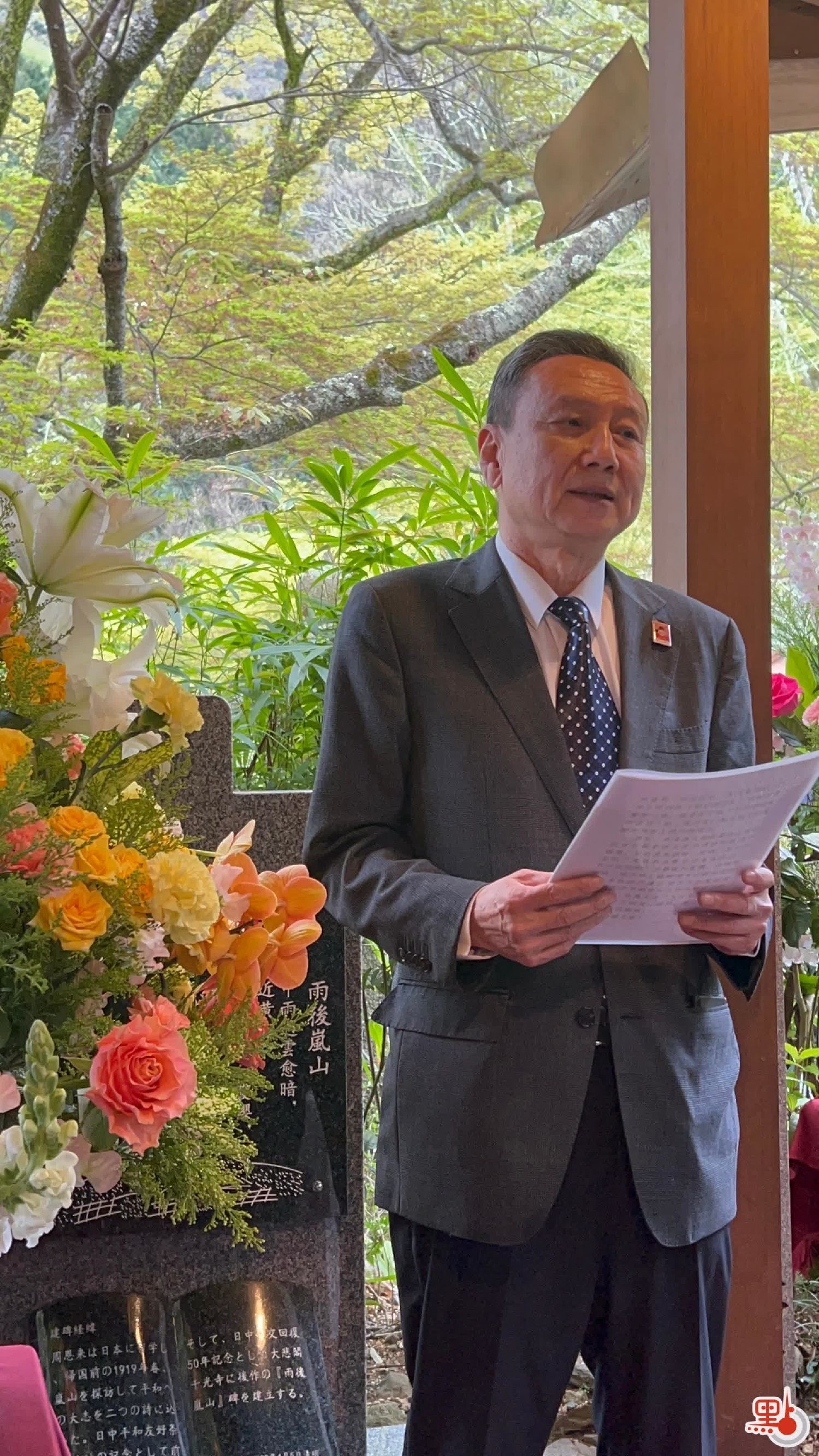 周恩来总理后人周秉和致辞时指出,今天在京城樱花盛开的美丽时节,来到岚山大悲阁千光寺,作为周恩来总理后出席本次纪念活动,让他倍感心情激动。周总理生前对中日关系非常重视,正是他不断克服障碍,打破僵局,推动中日关系向前发展,才最终实现了中日邦交正常化。当初周总理所撰诗作至今已逾百年,我们一路从岚山走来,深切感受到了当年“为中华之崛起而读书”的心路历程,身心得以陶冶。希望通过本次活动,祝福中日两国友谊长存。