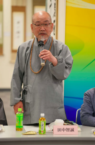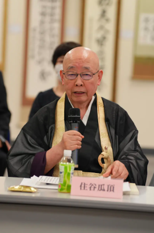 8日,在研讨会上发言的黄金宗瑞龙寺的住谷瓜顶住持。(东京新华社发布)
