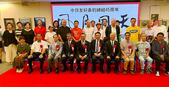 为了庆祝中日和平友好条约签订45周年,由日本国际经济文化机构和中国文化中心主办,多家艺术团体和媒体后援的“风月同天”中日艺术家共同展开幕式七月十日下午在中国文化中心隆重举行。中日友好团体领导、媒体记者、著名书画家和爱好者、大学教授出版社社长、旅日侨领等不顾天气炎热,近百人出席了开幕式。