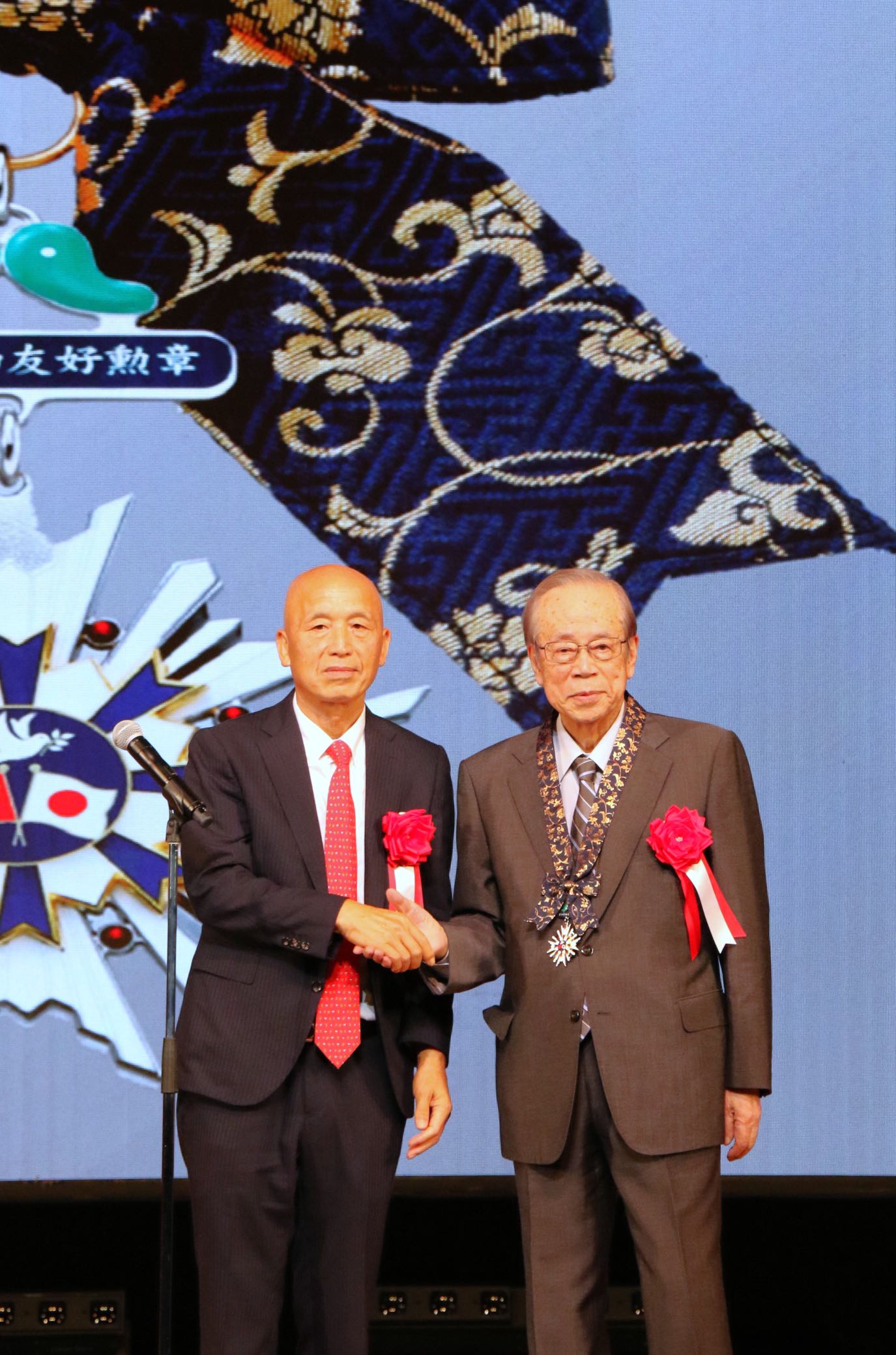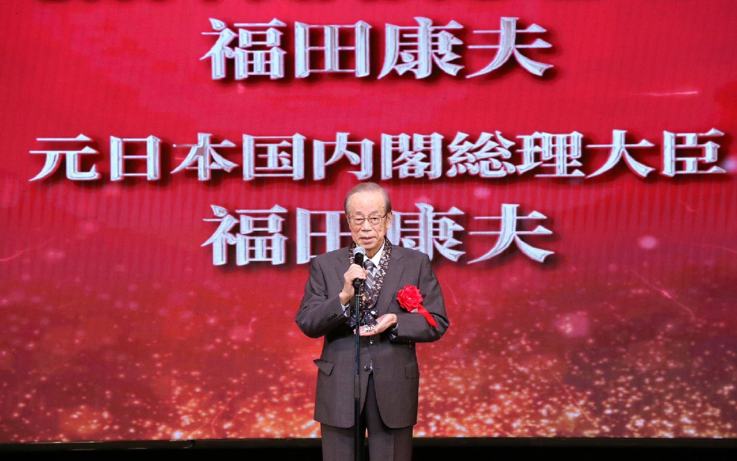 日本前首相福田康夫致辞表示:能够获得这一勋章将会成为自己珍贵的记忆。他还表示:中国拥有日本25倍以上的国土面积,以及10倍以上的人口数量。如此庞大的国家可以发展到如今政治安定、国泰民安的繁荣景象,十分令人敬佩。期待各位在日华人与日本民众一起,共同为两国的经济、社会发展做出贡献。