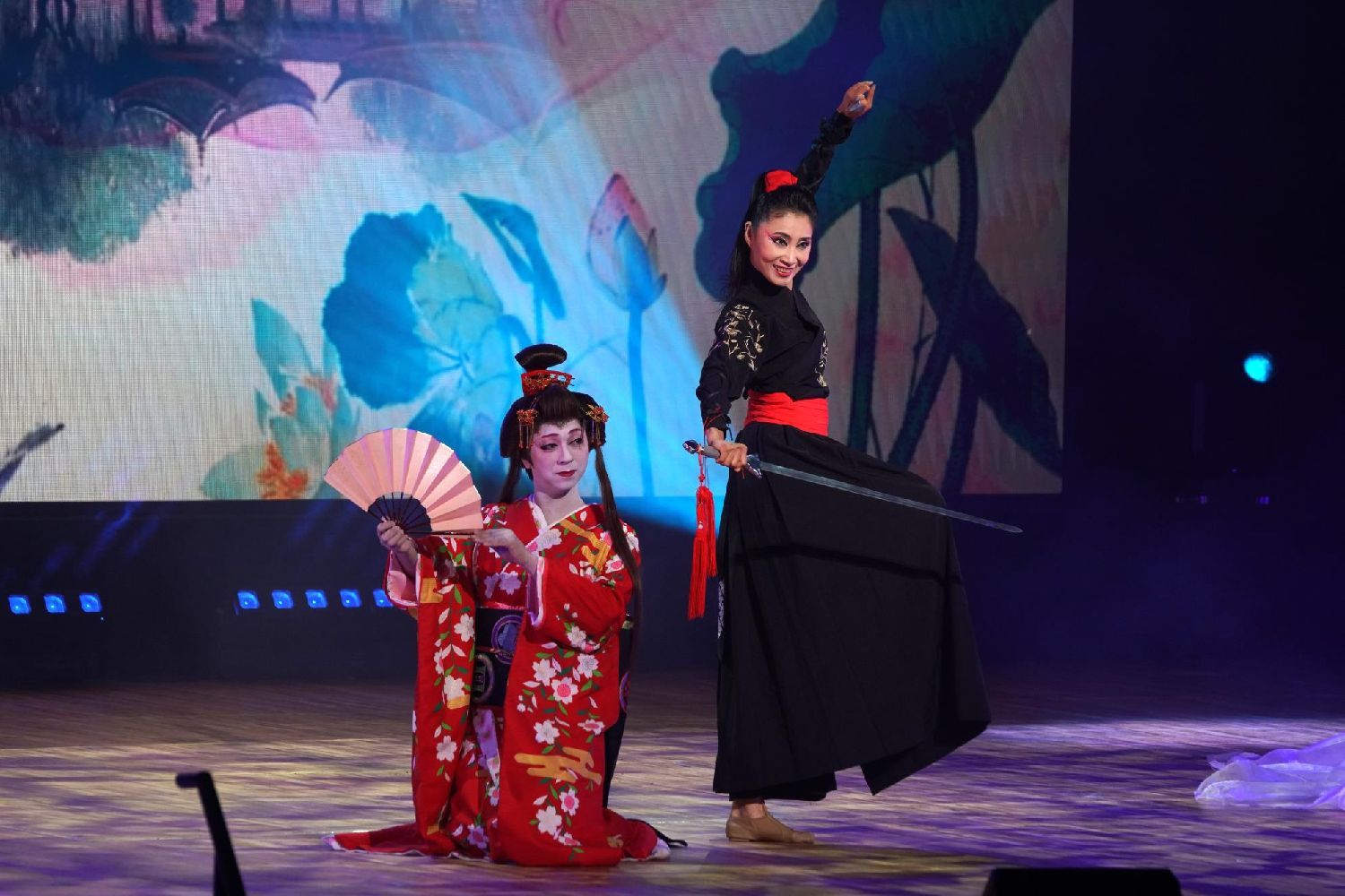中日艺术家联手打造的《高山流水》是晚会的一大亮点。在中国的古筝演奏家毛丫和日本尺八演奏家长谷川将山的合奏声中,中国舞蹈家张屹化身帅气的剑客,日本舞蹈家孝藤右近变身柔美的艺伎,共同演绎了一部精彩大作。