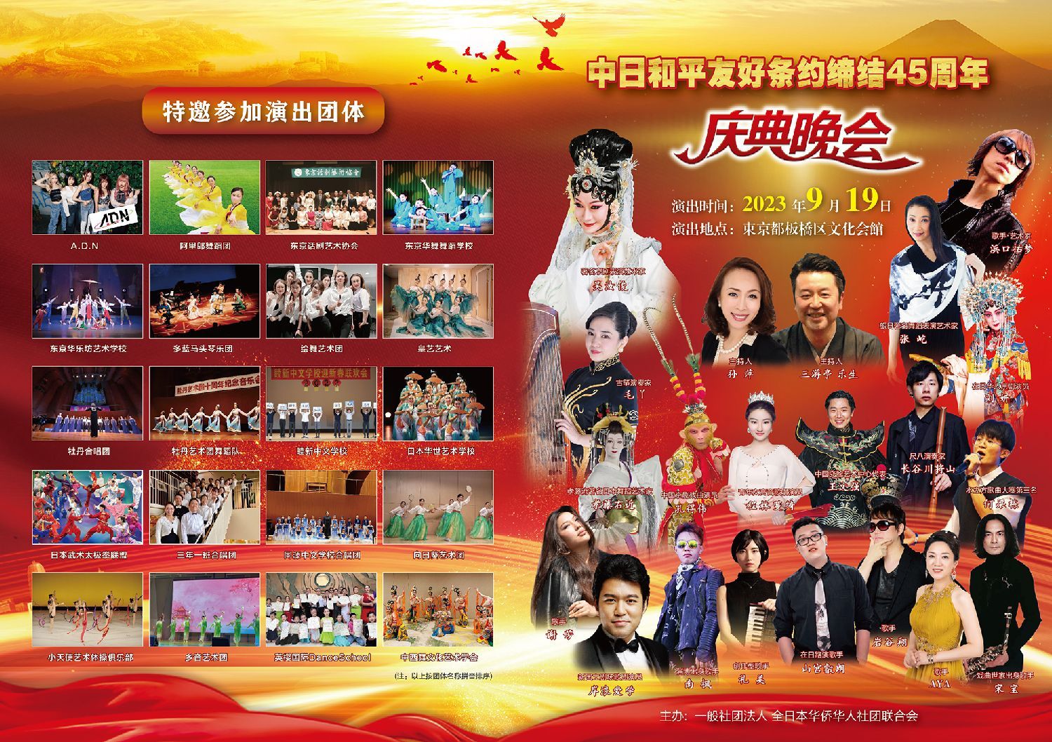 2023年9月19日晚,在东京板桥区立文化会馆,中日和平友好条约缔结45周年庆典晩会(以下简称“晚会”)圆满落下帷幕。该晚会由一般社团法人全日本华侨华人社团联合会(以下简称“全华联”)主办,日本华侨华人联合总会、东京华侨总会、日本中华总商会协办,中华人民共和国驻日本国大使馆等机构后援,江苏洋河酒厂股份有限公司冠名赞助,贵州茅台酒特别赞助,源清田商事株式会社、九州华侨华人联合会、东京朝日全球株式会社、中京国际株式会社、日中经济文化友好促进会、比亚迪日本株式会社、中国移动国际株式会社赞助。