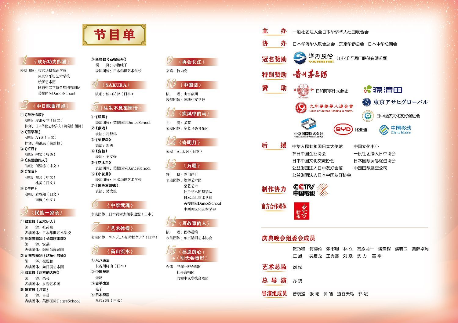 其中,不仅有多名在日华人和日本艺术家带来的京剧、地方戏、中国传统乐器、日本传统乐器,也有多个在日华人艺术团体带来的彝族、朝鲜族、藏族、傣族、维吾尔族等中国少数民族舞蹈,以及中日两国歌手联袂出演的双语歌曲大串烧。