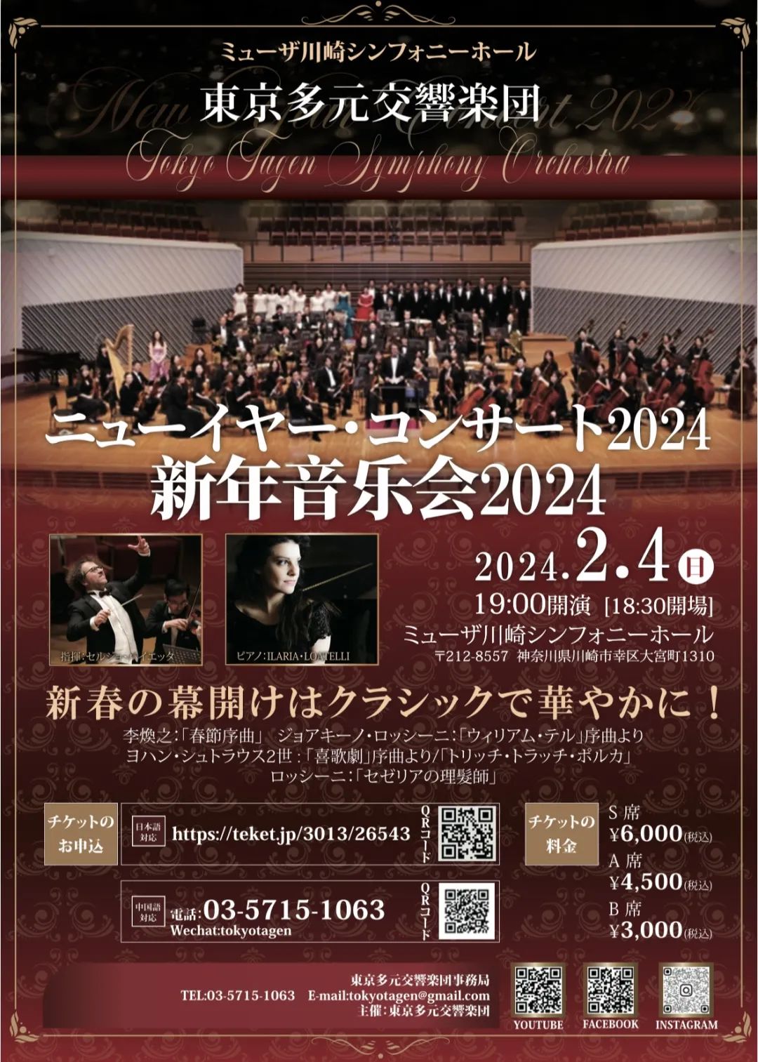 【少儿侨报讯】东京多元交响乐团正紧锣密鼓地进行为期三天的新年音乐会联排,为即将在2月4日在ミュザ川崎シンフォニーホール举行的演出做最后精进。2024年新年音乐会依旧汇聚了各国音乐家,包括31日到达日本东京的意大利的著名指挥家Sergio Baietta和钢琴家ILARIA LOATELL,以及中日优秀音乐家,共同登台。