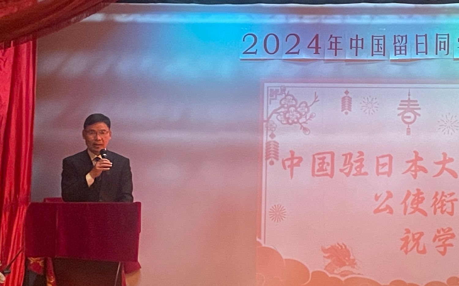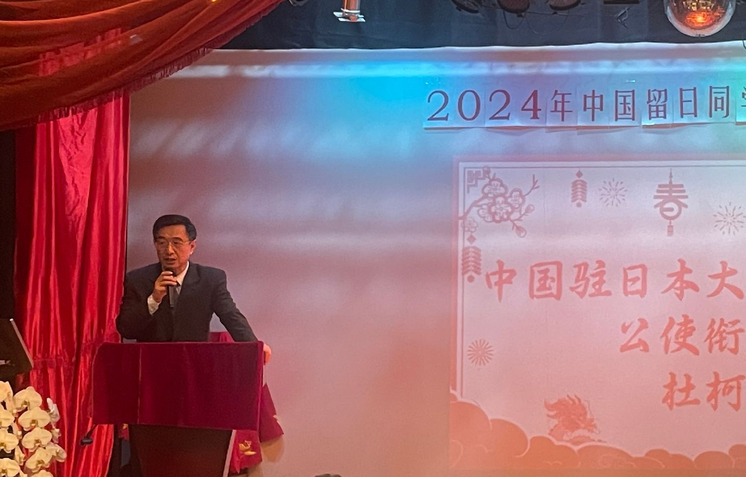 中国驻日本大使馆教育处公使衔参赞杜柯伟在致辞中向本次新春交流会表示了祝贺。杜柯伟说,中国留日同学总会作为留日学人的核心团体和精神家园,有着100多年的光荣历史。杜柯伟希望,中国留日同学总会进一步发挥自身优势和平台作用,主动作为,不断开创新局面,为中日各领域交流和在日留学生发展做出新的更大的贡献。希望大家继续关心支持中日两国的教育合作和青少年交流事业,积极建言献策,共同为培养促进两国关系友好发展的人才贡献力量。