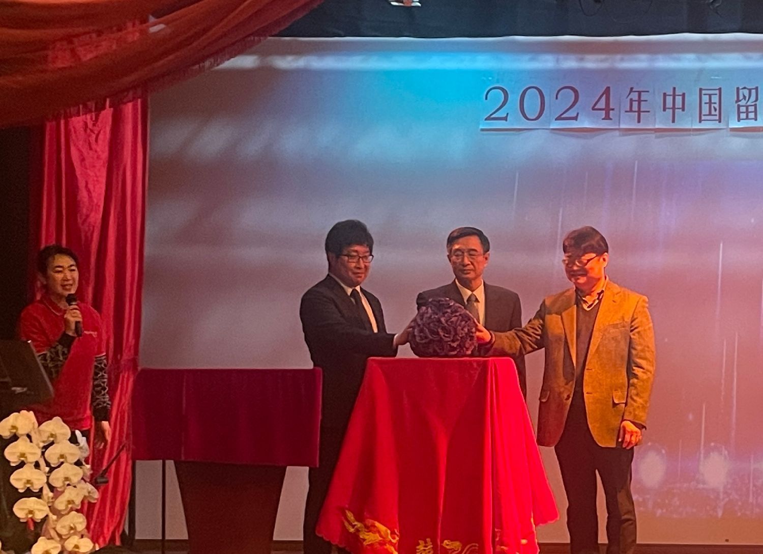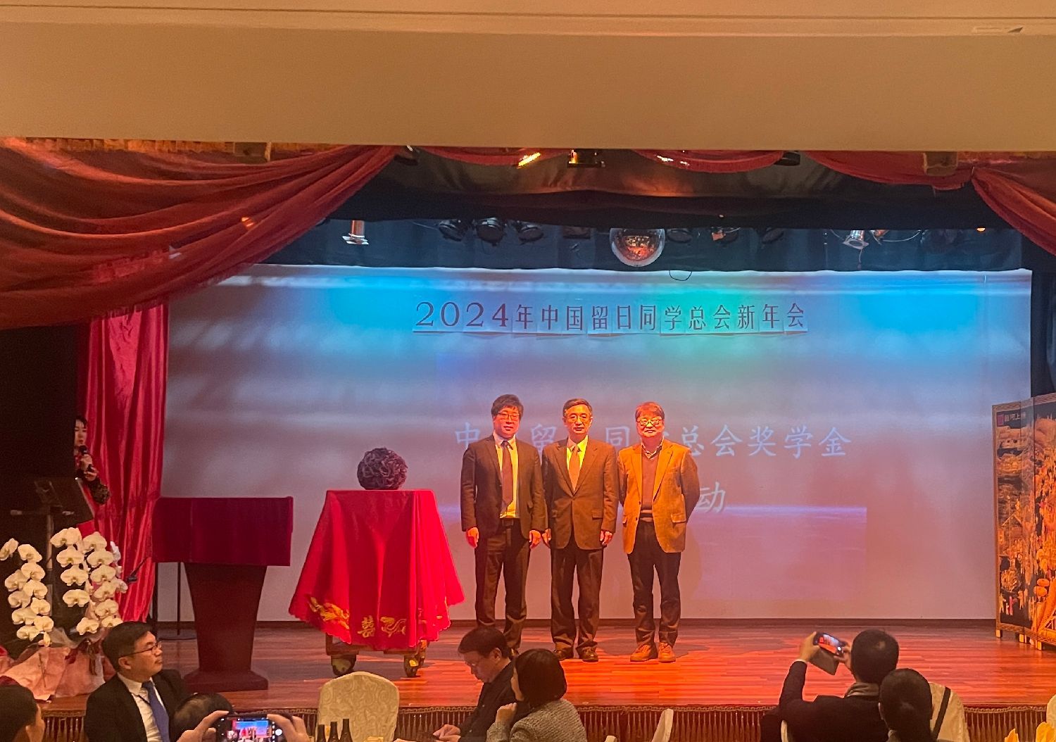 中国留日同学总会会长刘恩玺,中国驻日本大使馆教育处公使衔参赞杜柯伟,春晖计划博士专家团团长、中国留日同学总会专门家协会会长赵新为共同启动中国留日同学奖学金仪式。