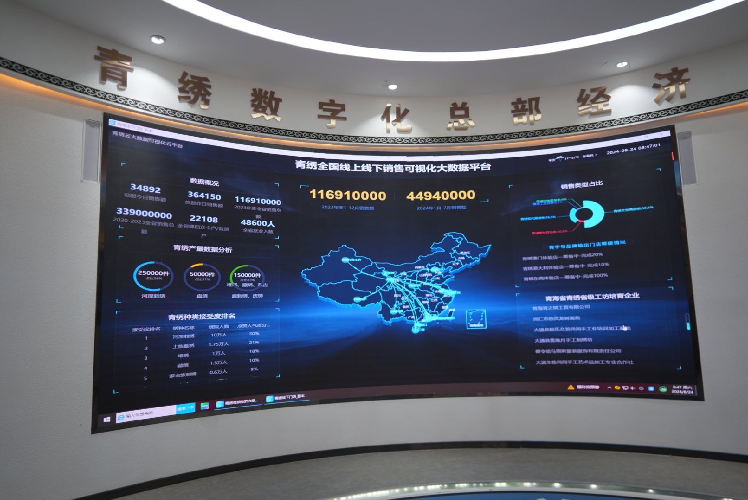 在总部,记者们看到大屏幕上实时显示昨日销售达36万多元,今年以来销售总额已达4494万元,青绣中深受青睐的种类依次为河湟刺绣、土家盘绣、堆绣、藏绣和蒙古族刺绣等。作品中既有各民族传统服饰,又有动植物造型玩具玩偶摆设;既有绣片挂毯美术品,也有箱包等日用品。最引人注目的是国潮服装和动漫IP产品,颇为受人欢迎。