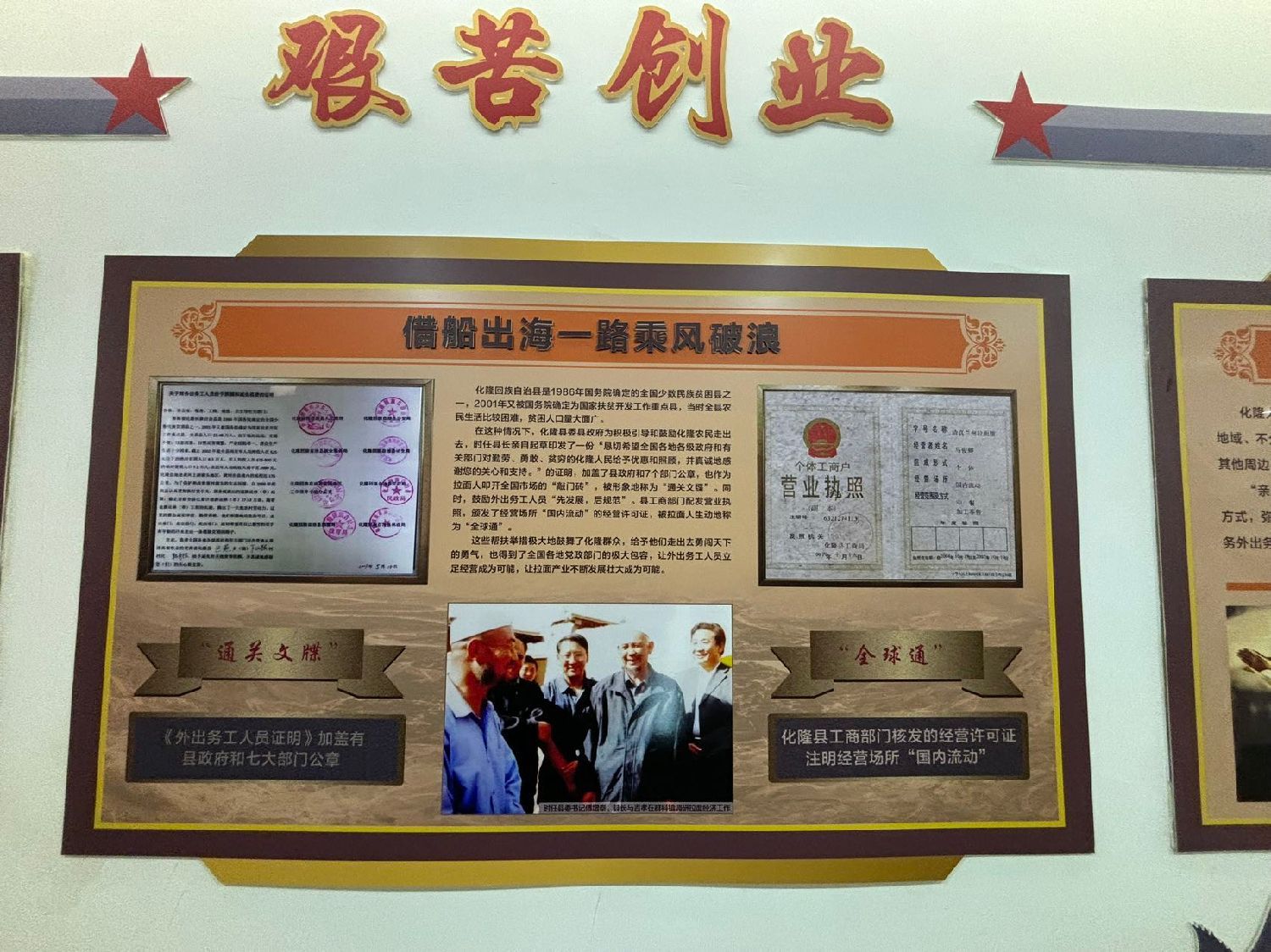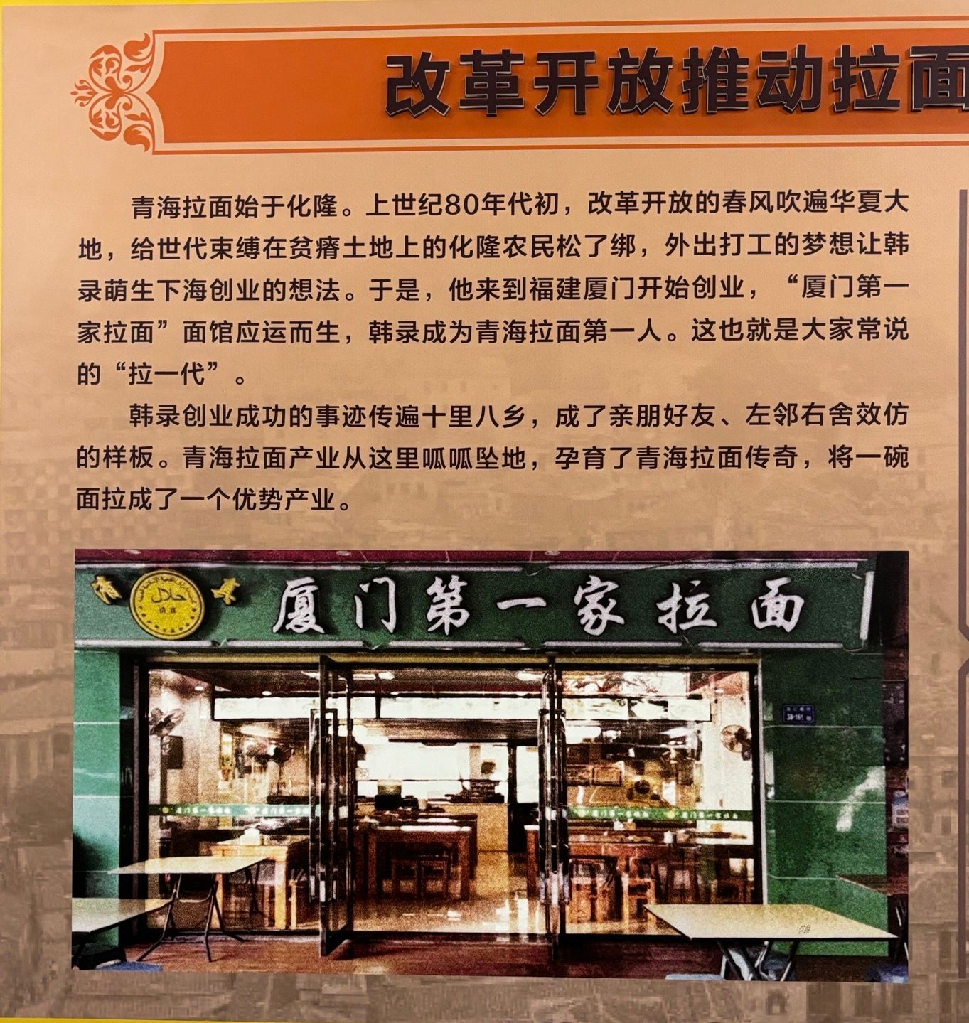 大家都吃过拉面,大家知道拉面的故乡在哪里吗?是的,在青海省海东市化隆回族自治县。在化隆县的青海省拉面产业孵化基地,记者发现了一张有趣营业执照和一张鲜见的“通关文牒”。那是由化隆县工商局开具的营业执照,字号名称却为“清真兰州拉面馆”,营业场所为“国内流动”。“通关文牒”则是由县政府和公安局等八个部门联合盖章,发给从事清真餐饮业的外出务工向各省、市公安、税务、工商、城建、卫生等部门出具的证明书。这反映了化隆县作为少数民族贫困县的辛酸历史和全国人民对少数民族地区扶贫工作的支持。