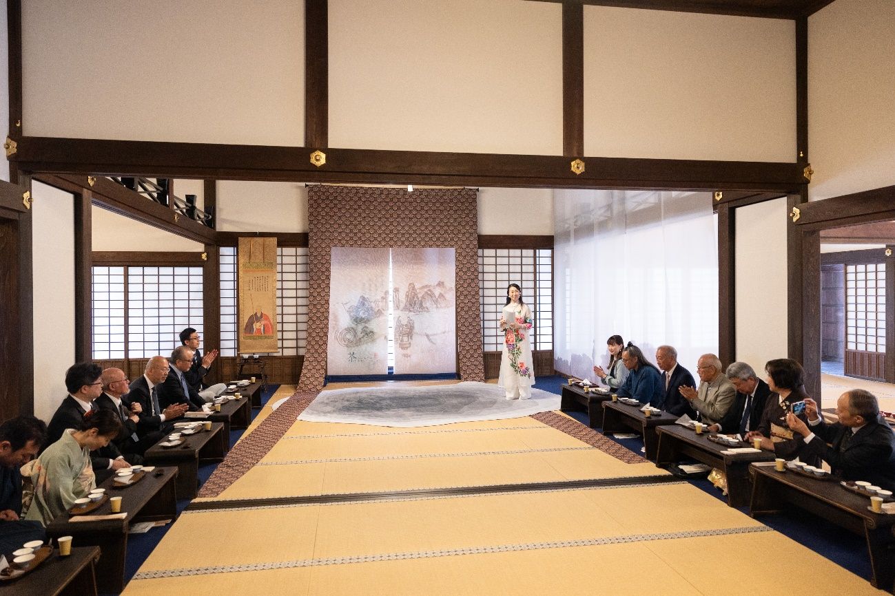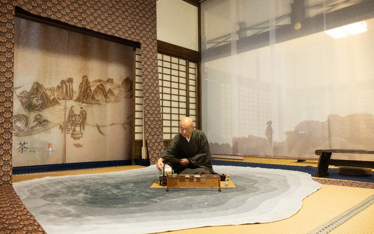 在象征中日文化交融的枯山水画轴前,黄檗宗大本山万福寺的管长近藤博道猊下与荒木将旭执事长,恭敬地献上宇治本地的“青雫”煎茶和特制的“隐龙”乌龙茶。随着茶香四溢,来宾们轻轻闻香、细细品茶,感受“茶和天下”的理念。