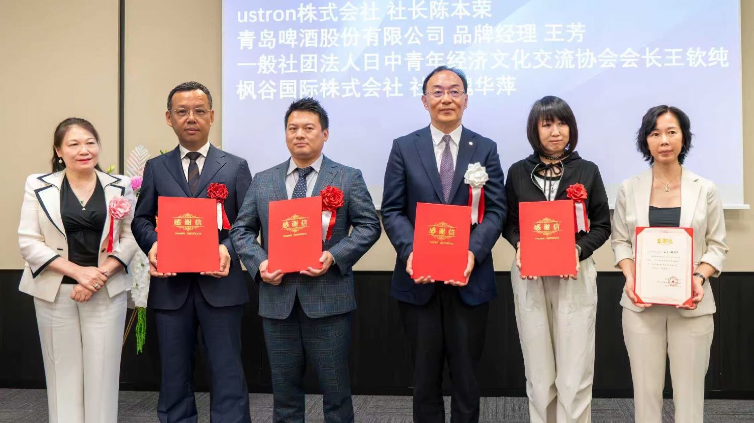 在颁发感谢状环节,千代田教育集团会长陈秀姐女士代表主办方,分别向中国国际航空公司日韩地区支社社长冯力、一般社团法人日中青年经济文化交流协会会长王钦纯、枫谷国际株式会社社长魏华苹、ustron株式会社社长陈本荣、青岛啤酒股份有限公司品牌经理王芳颁发感谢状,并表示正是各方的通力合作与支持,才让首届“国航杯”演讲交流大赛顺利举行、圆满成功。