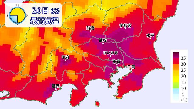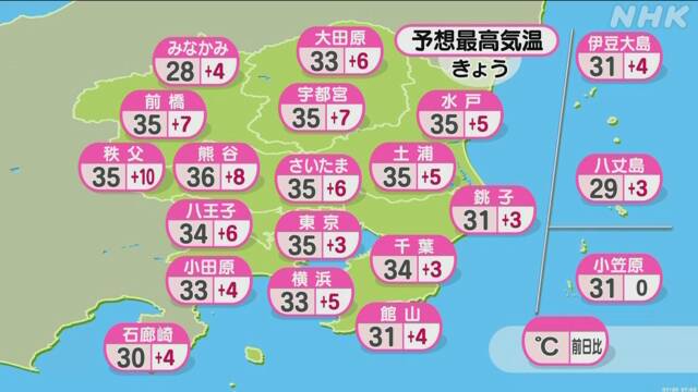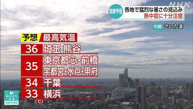 而在该天气的影响下,东京都内多地气温将会升至35摄氏度以上,并且预计在埼玉县方面更将会达到36摄氏度以上的高温。