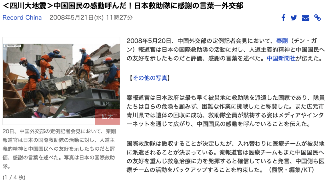 当时的时任中国驻日本大使崔天凯,对日本救援队赴华表示感谢。他说:“日本救援队专业性强,拥有先进工具和实地作业经验,一定会为抢救更多生命、进行灾后救援发挥积极作用。”
