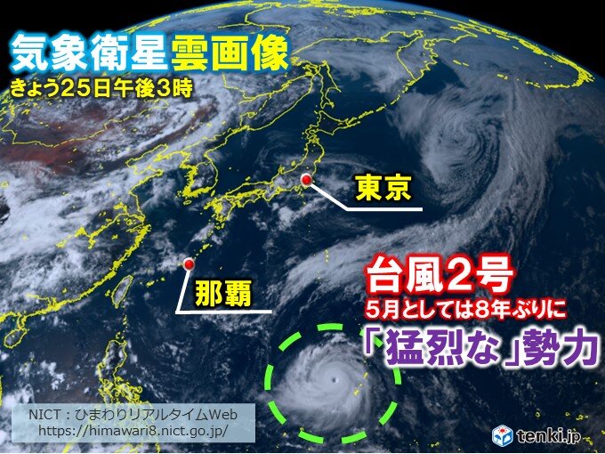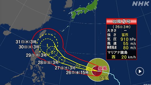 另据日本气象厅的表示,此次的台风2号已经在早上3点前后以每小时20公里的速度向西穿过日本南方的马里亚纳群岛。台风中心气压为910帕斯卡,中心附近的最大风速为55米/秒,最大瞬时风速为80米/秒,且在中心半径165公里以内的区域内,风速达到或超过25米/秒。