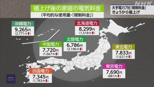 各电力公司为家庭提供的电费平均值将与提价前相比,变动为北海道电力上涨1518日元至8299日元;东北电力上涨1621日元至7833日元;东京电力上涨881日元至7690日元;北陆电力上涨2196日元至6786日元;中国电力上涨1667日元至7720日元;四国电力上涨1783日元至7345日元;冲绳电力上涨2771日元至9265日元。