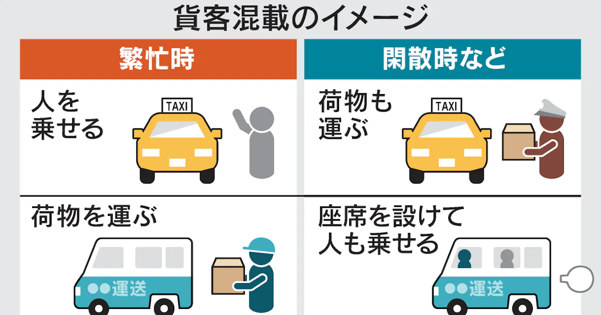 对此,有地方政府提出了使用出租车为老年家庭提供药品和食品配送的相关服务,或者使用货车同时运输生活必需品和乘客等提议。而国土交通省着计划根据地区实际情况,推动客货混运制度的引入。