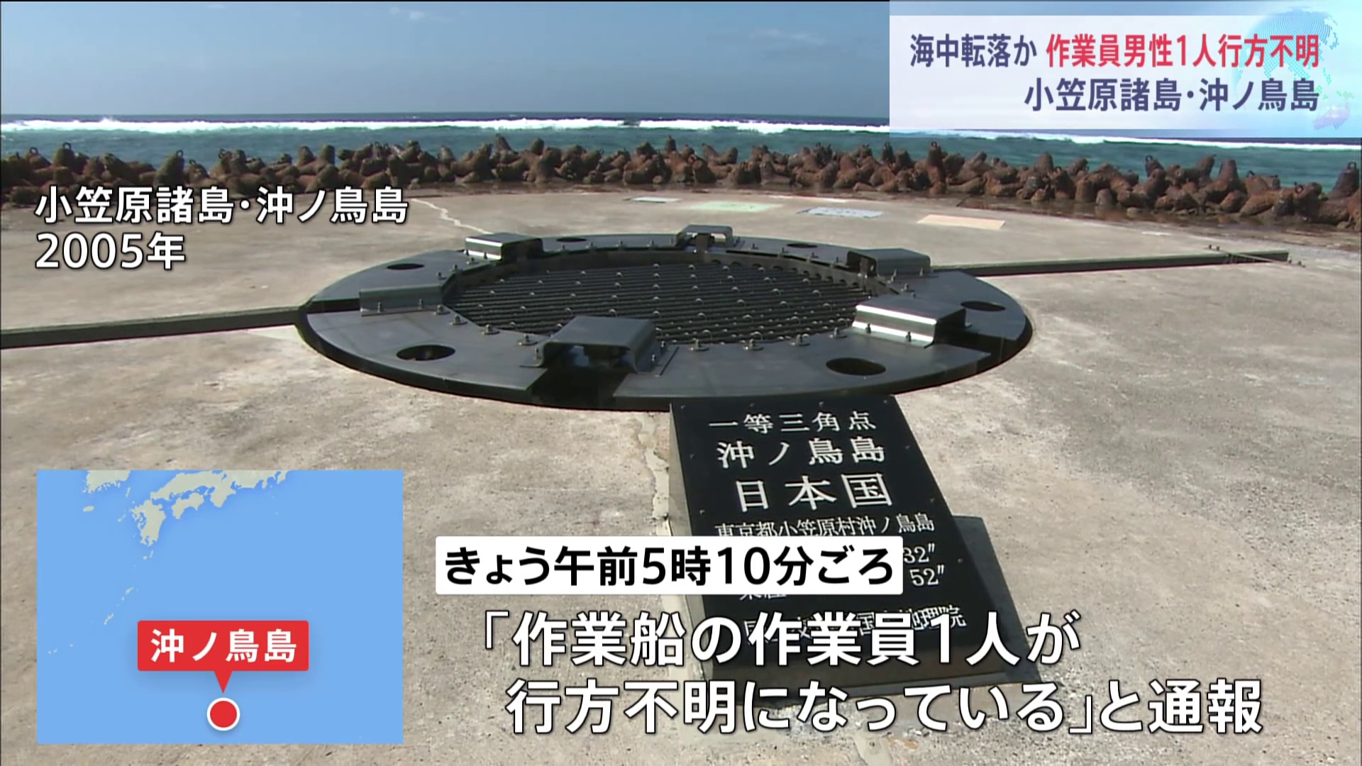 7月1日凌晨5点后不久,第三地区海上保安总部接到通知,在冲之鸟岛进行港口建设工作的工作船上的一名63岁男性工人失踪。