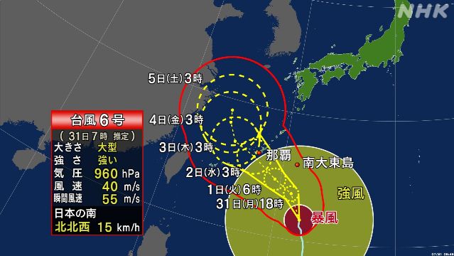 据气象厅报道,大型台风6号在本月31日上午7点以每小时15公里的速度在日本南部海域向西北方向缓慢移动。