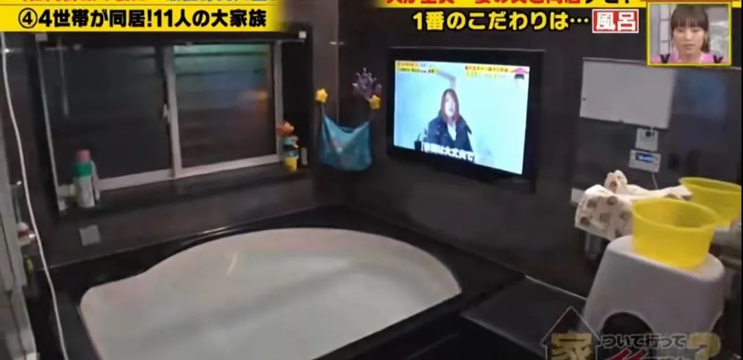11口四代同堂的一户建有三层,总共是8LDK的构造,光是客厅就有50多平方。他们家装修最特别的地方就是在浴室,正对浴缸的墙面装了台嵌入式电视,这样就可以一边泡澡一边看电视;笼头是可以进行肩膀浴的款式,也有像温泉那样各种垂下式的淋浴方式。