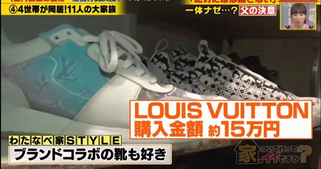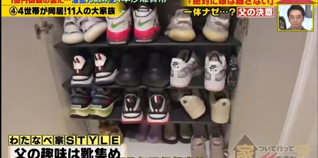 至于社长,也展示了他自己的爱好,就是鞋子。夫人打开一个柜子全是各种品牌球鞋,每一双都价值不菲,一双迪奥将近17万日元(近9000元人民币),一双香奈儿15万日元(近8000元人民币)…除了昂贵的鞋,还有各种金银首饰,就放在客厅的展示柜里,都不是在保险柜里。社长渡部也很开心的戴上几款,向记者展示。