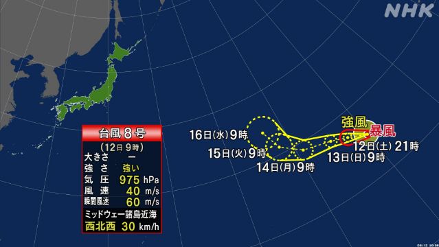 (日本头条讯)8月12日上午,在日本东南方向的中途岛附近海域生成了台风8号。预计该台风不会直接影响日本。