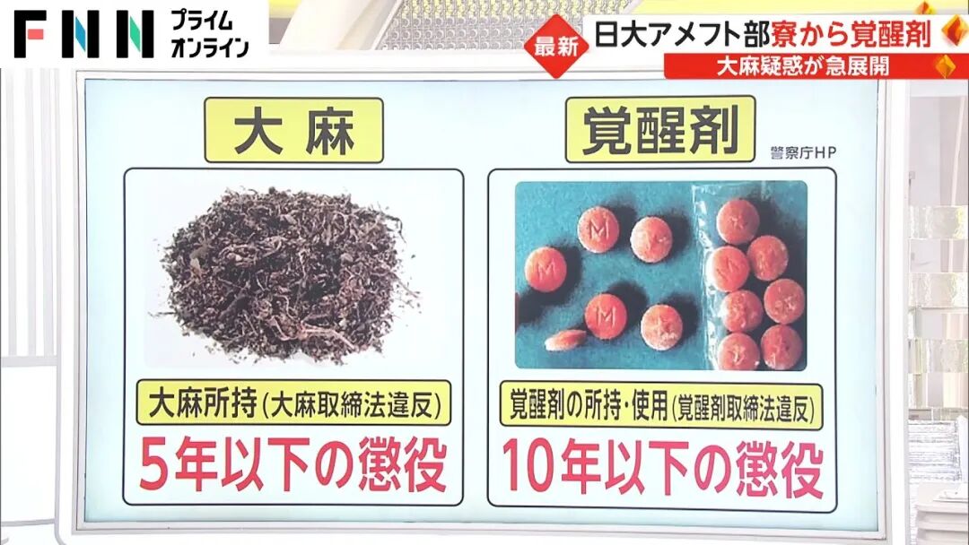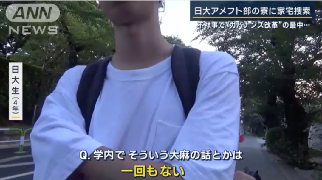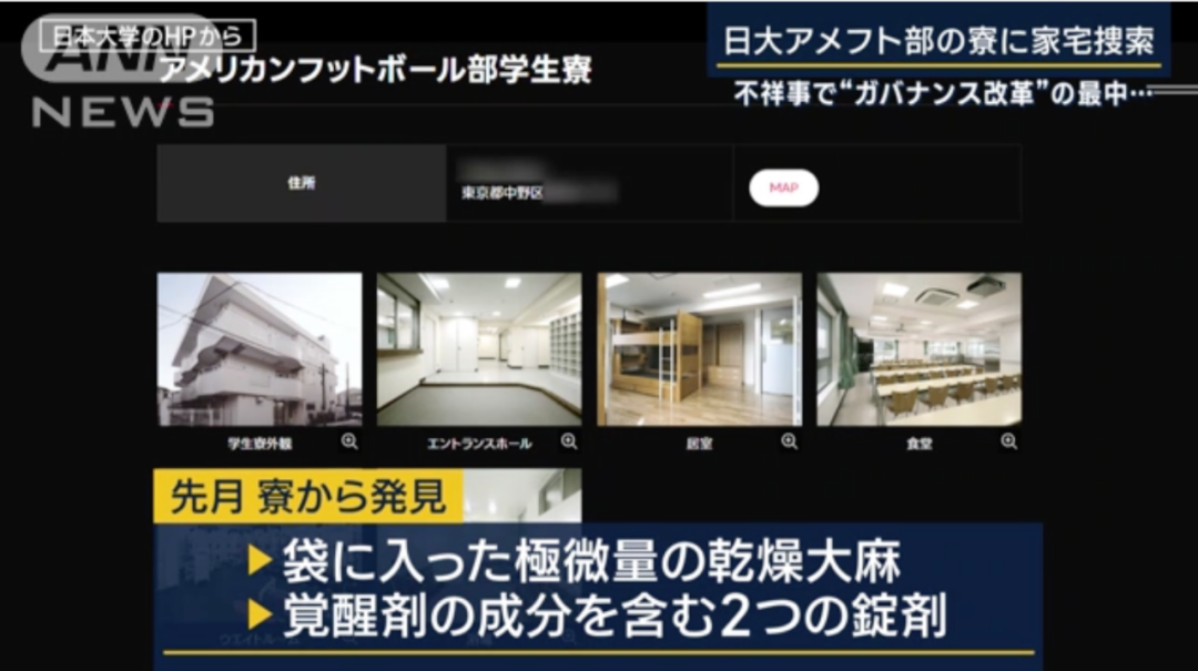3日,警视厅派20名警力,花了5个小时左右,在东京中野区的日本大学美式足球队员学生宿舍,搜查到了到“大麻”和“兴奋剂”等违禁毒品。