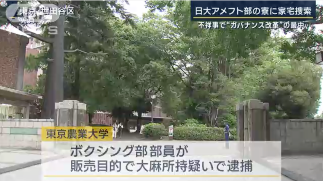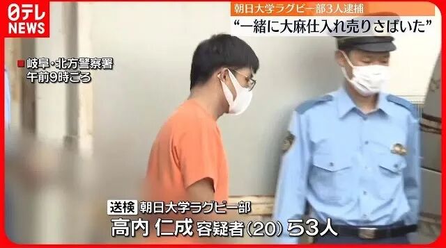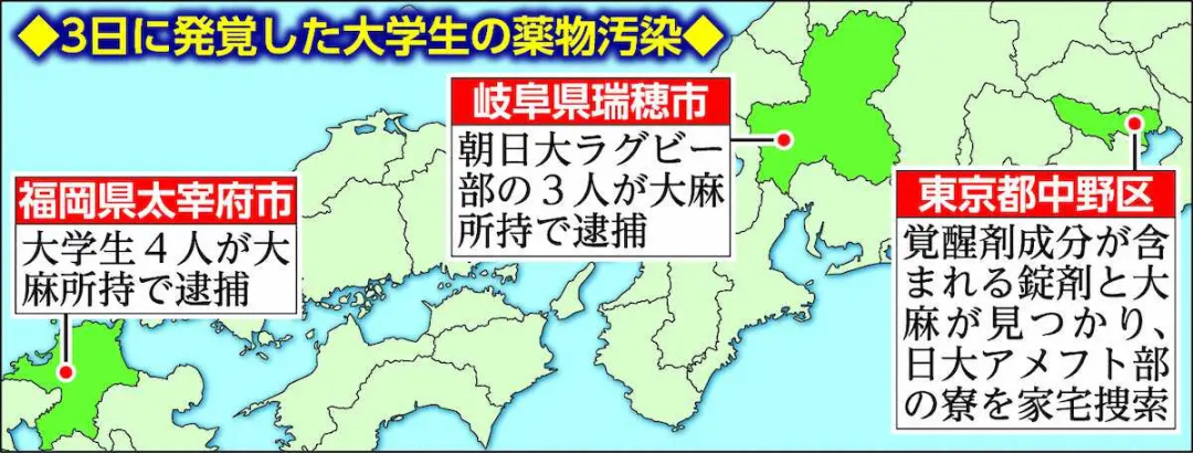 上个月,东京农业大学的拳击部成员因涉嫌持有以销售为目的的大麻而被逮捕。3日,在朝日大学橄榄球部的3名成员,同样以销售为目的持有大麻,岐阜县警察对集训所进行了搜查。