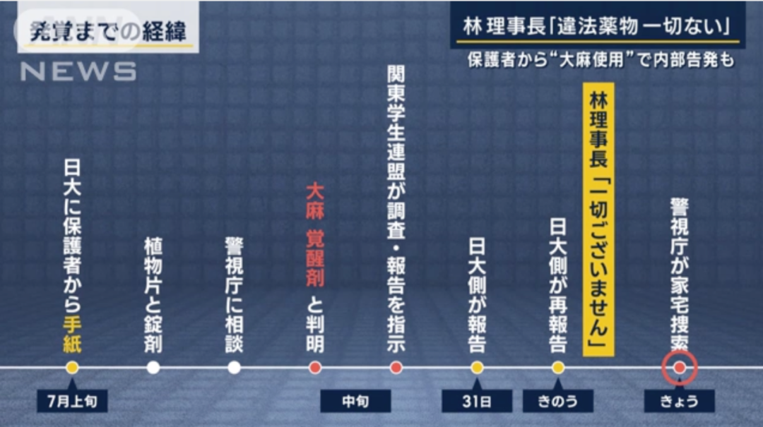 上个月上旬,日本大学收到了自称是学生监护人的人的内部告发信。大学方面调查了学生宿舍,的确发现了可疑植物碎片和药片。之后,校方报告警方。