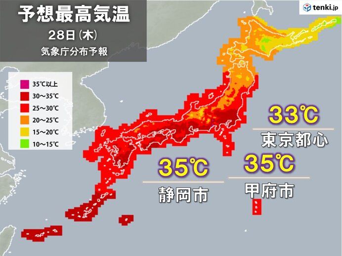 (日本头条讯)就在本月28日前后,预计在日本东部到西部的太平洋沿岸地区将迎来进入秋季后的又一轮酷暑天气,而随着气温上升,日本东海和关东甲信地区有可能出现35度以上的高温天气。