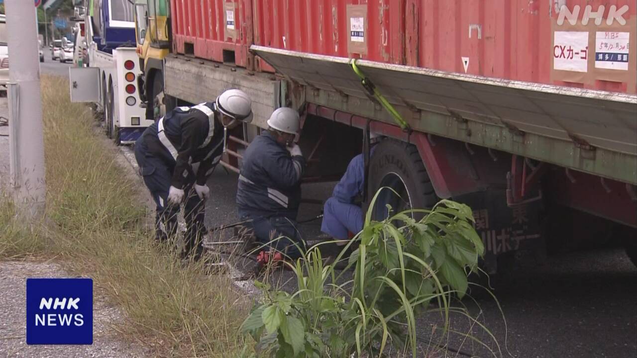 据警方称,12月23日清晨6时左右,在冲绳县浦添市矶的国道330号线上,一辆载有集装箱、向宜野湾市方向行驶的大型卡车左侧的一个后轮胎因故脱落。
