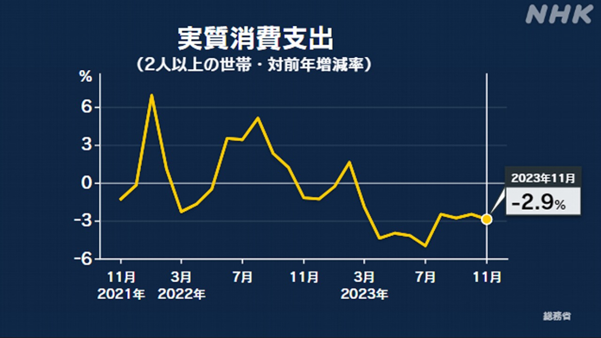 (日本头条讯)日本总务省9日公布的数据显示,2023年11月,日本2人或以上家庭的实际消费支出(不包括价格变动)为286922日元,比上年同月减少2.9%。这是消费支出连续第9个月低于上年同期。