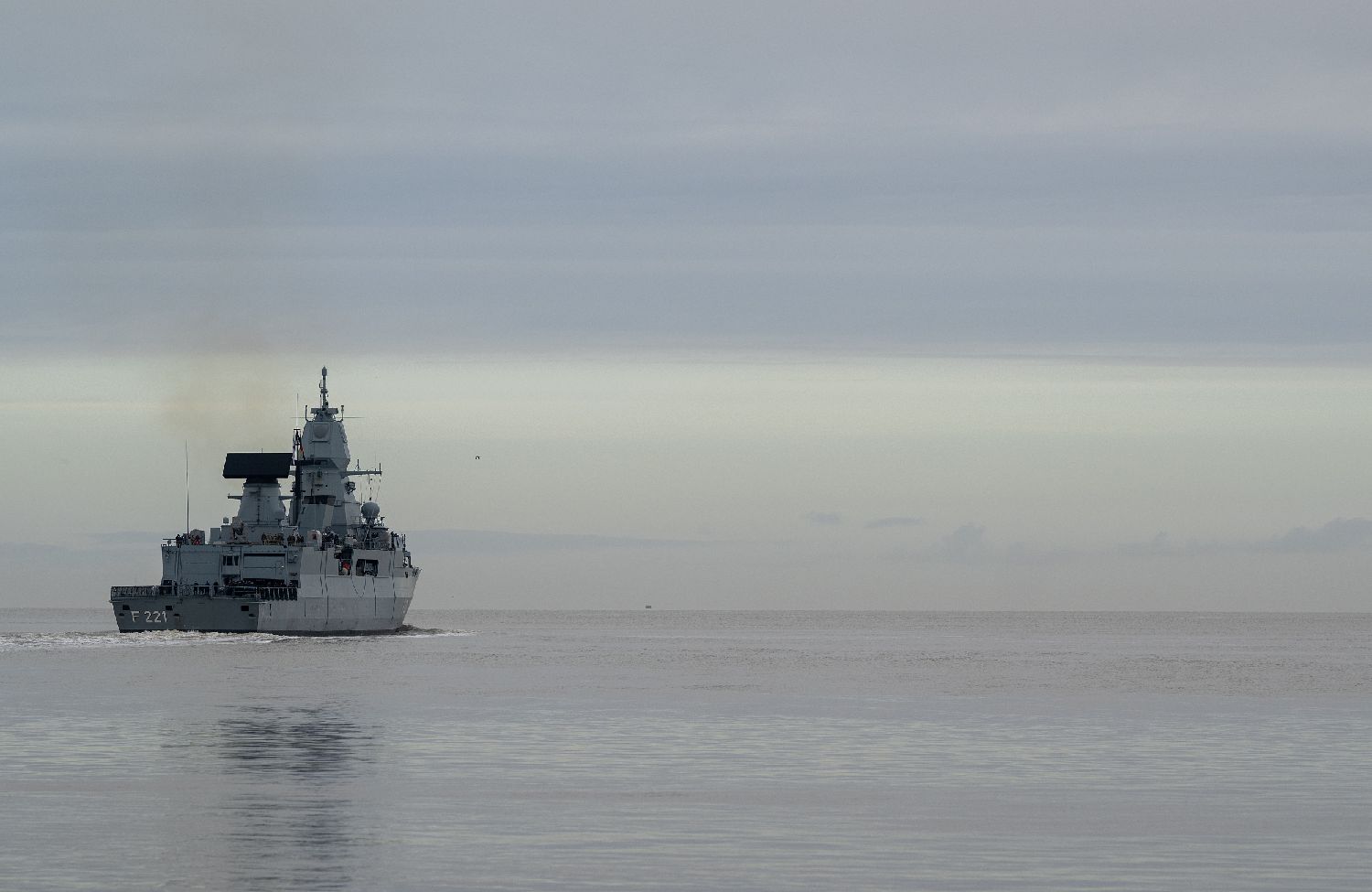 当地时间2024年2月8日,德国威廉港,德国"黑森"号护卫舰出发前往红海部署。视觉中国图