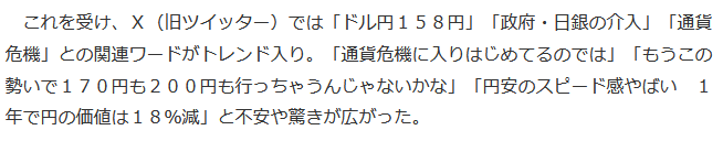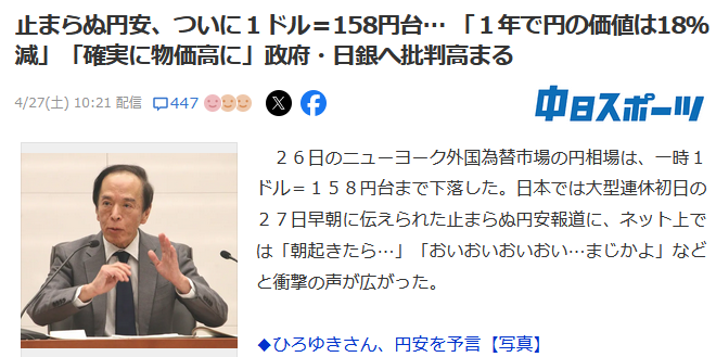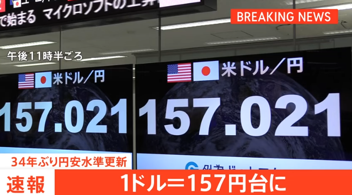 4月26日,纽约外汇市场上,日元对美元汇率一度跌破158日元!这是自1990年5月以来的最低,再次刷新了之前贬值的记录。