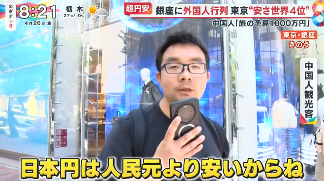 记者在那里随机采访,就遇到几个中国游客。问及为什么会选择到日本旅行购物时,一个男士直接回答:“因为日元比人民币便宜。”
