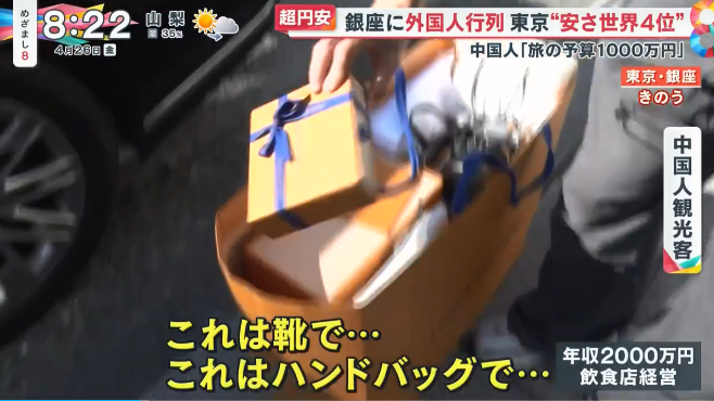 记者在银座外,遇见了一个拎着大包小包物品的男士。上前攀谈得知,男士是经营饮食店的中国游客,他的年收约2000万日元(折合人民币约92万)。