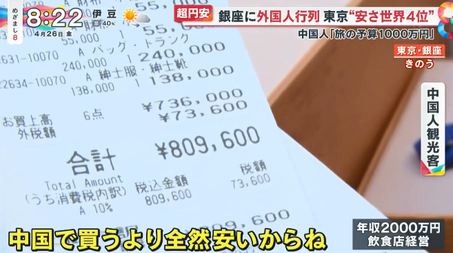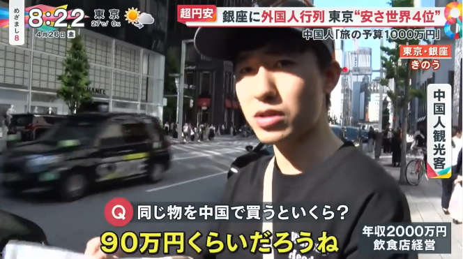 能便宜多少呢?男士想了想说,他买的东西在国内大约要花90万日元(折合人民币约4.12万)。