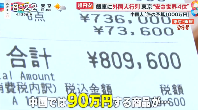 同样的物品,国内要花90万日元,在日本却只花80.96万日元,差价约9.04万日元,也就是4100元人民币。