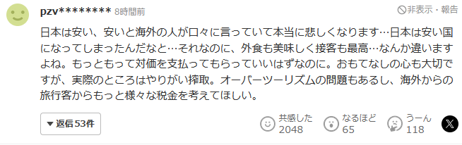 外国人异口同声地说日本便宜、便宜,真让人悲伤。日本已经变成了便宜的国家……尽管如此,在外面吃饭的客人,都能享受最好的服务。总觉得不一样呢。他们应该多付出些代价的。招待客人的心情很重要,但这实际上是在剥削价值。另外也会有过度旅行的问题,希望考虑让来自海外的游客缴纳更多的税金。