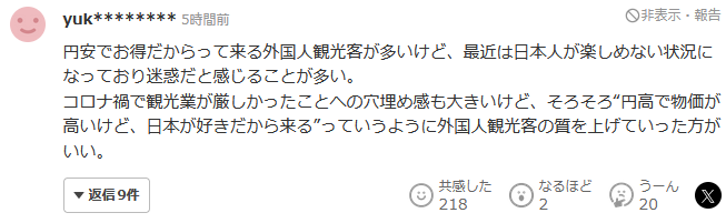 由于疫情影响,旅游业受冲击比较大,现在终于好些了。但还是希望外国游客的整体质量更好一些,比如“日元升值物价很高,但因为喜欢日本所以来”。