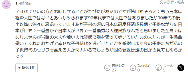 我小时候是日本经济高度成长期,虽然是孩子,但我觉得日本是世界上最富裕的,日本人是世界上最优秀的。虽然不是所有人,但当时的大人和年轻人都是笑着挺起胸膛走路的。那些人努力工作,让我度过了幸福的时代。现在还有多少人能说出我童年的台词呢……