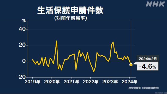 (日本头条讯)2024年2月,日本生活保护申请人数出现连续14个月下降的趋势,与去年同期相比减少4.6%。新获生活保护的家庭数也呈现下降态势,同比减少2.2%。然而,尽管申请人数有所下降,但生活保护受助家庭数仍处于近10年来的高位水平,达到1,649,681户。