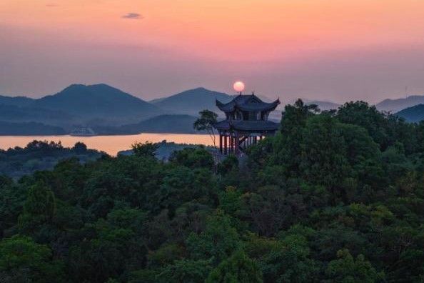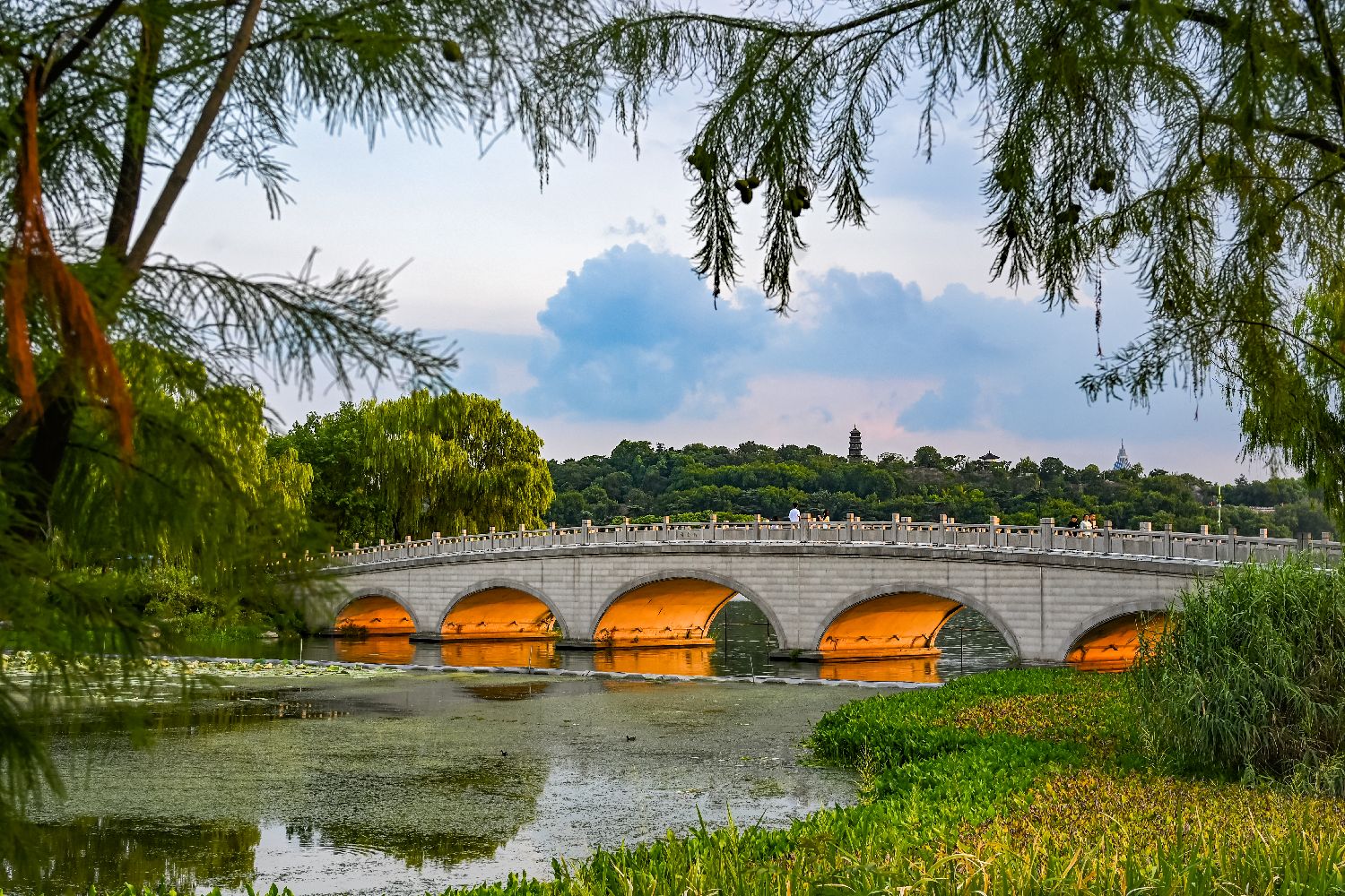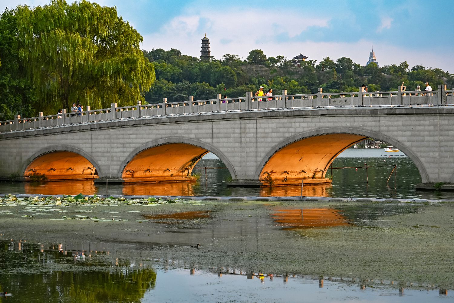 初秋之际,中国景色如画,山水间色彩斑斓,好似被大自然打翻的调色盘,展现季节更迭之美。图为29日傍晚,夕阳将南京玄武湖钟毓桥桥洞照亮,呈现“金光穿洞”景观。(中新社)