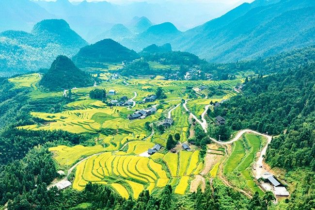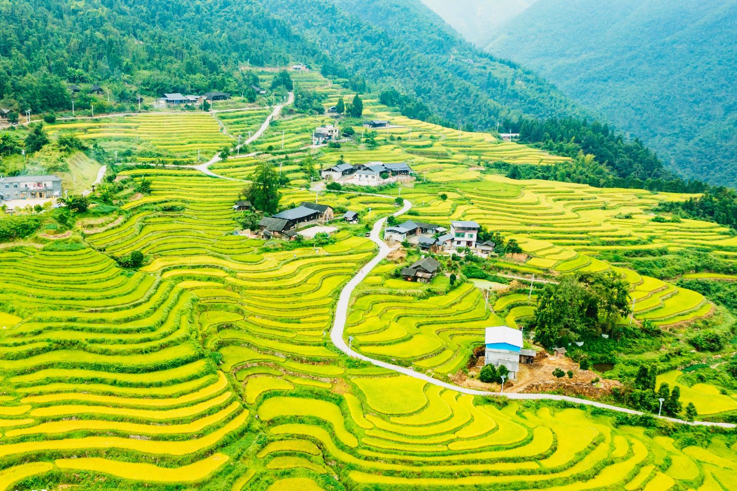 图为29日,湖南东安舜皇山国家森林公园,金黄的稻谷与层层叠叠的梯田、错落有致的村庄相互映衬,“丰”景如画。(人民网)