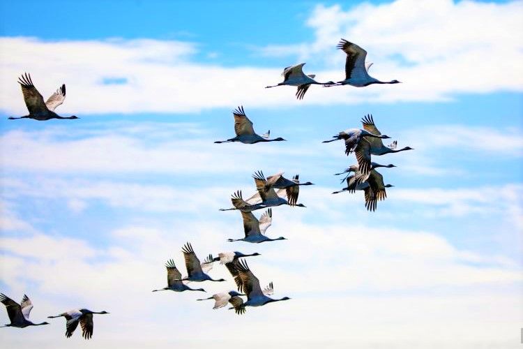 图为近日,在广袤的额仑草原,蓑羽鹤轻盈的羽翼划过蓝天自由飞翔,留下优美的弧线。(中新社)