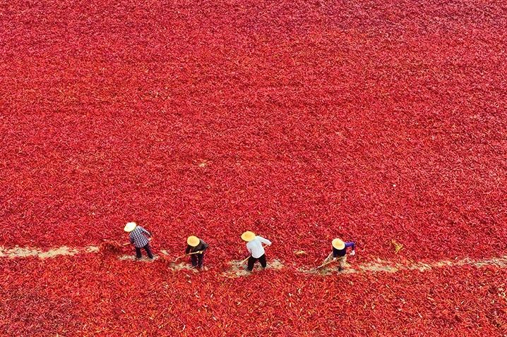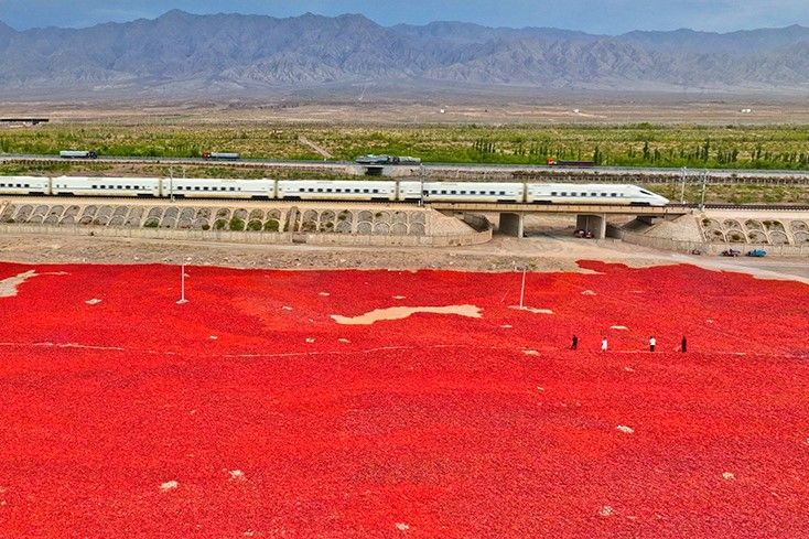 图为28日,甘肃省张掖市高台县南华镇区间段的兰新高铁线上,和谐号动车组疾驰穿梭,铁路线下的高台县南华镇明水村辣椒晾晒场内红艳如火。(人民网)