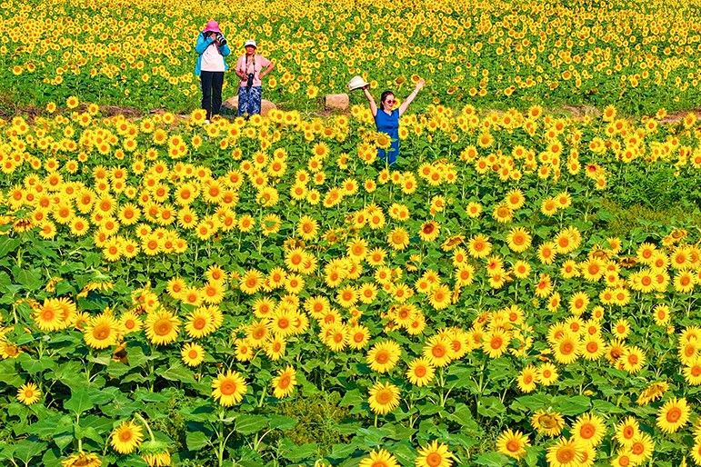 图为29日,陕西省西安市蓝田县小寨镇,游客在牛心峪村油葵花海观光游览。(人民网)
